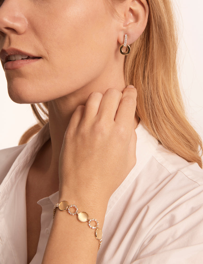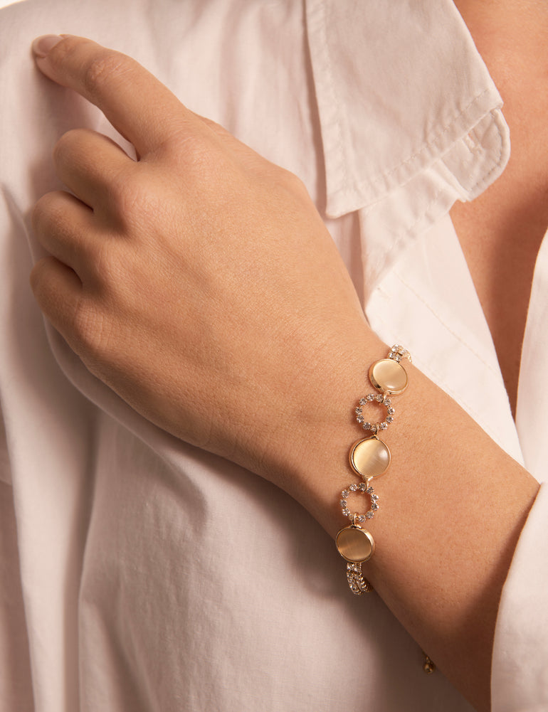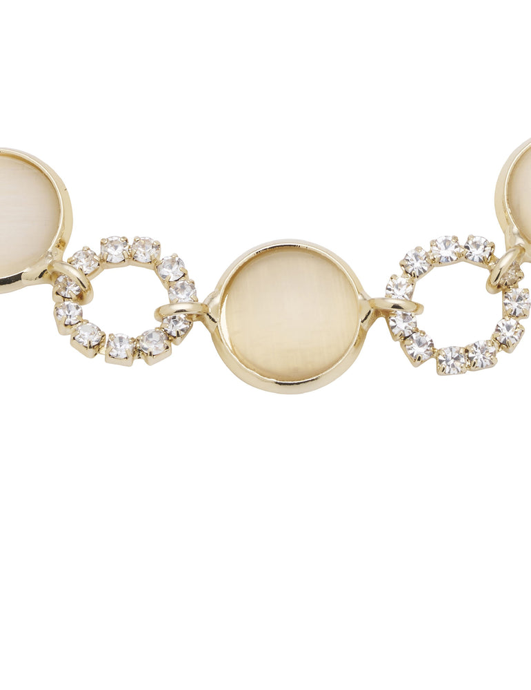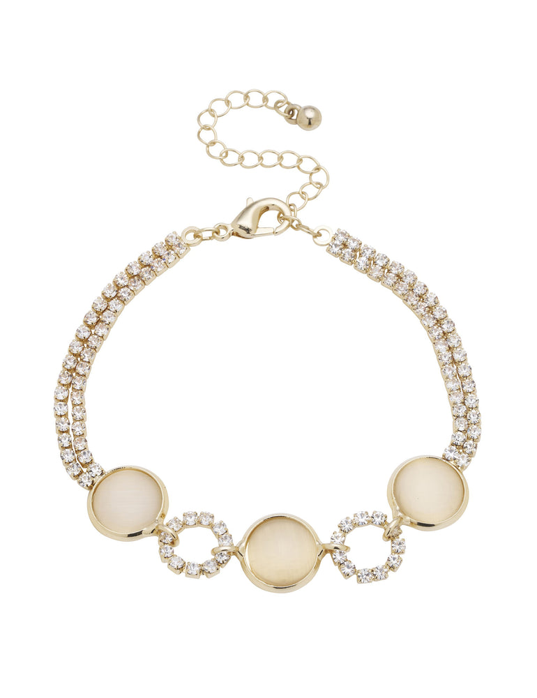 Bring sparkle and shine to day or evening looks with the beautiful Saturn Bracelet. This gorgeous bracelet features strands of sparkling stones in bright gold-coloured plating, with circular links feature fine stone detailing and glossy natural-toned feature stones.