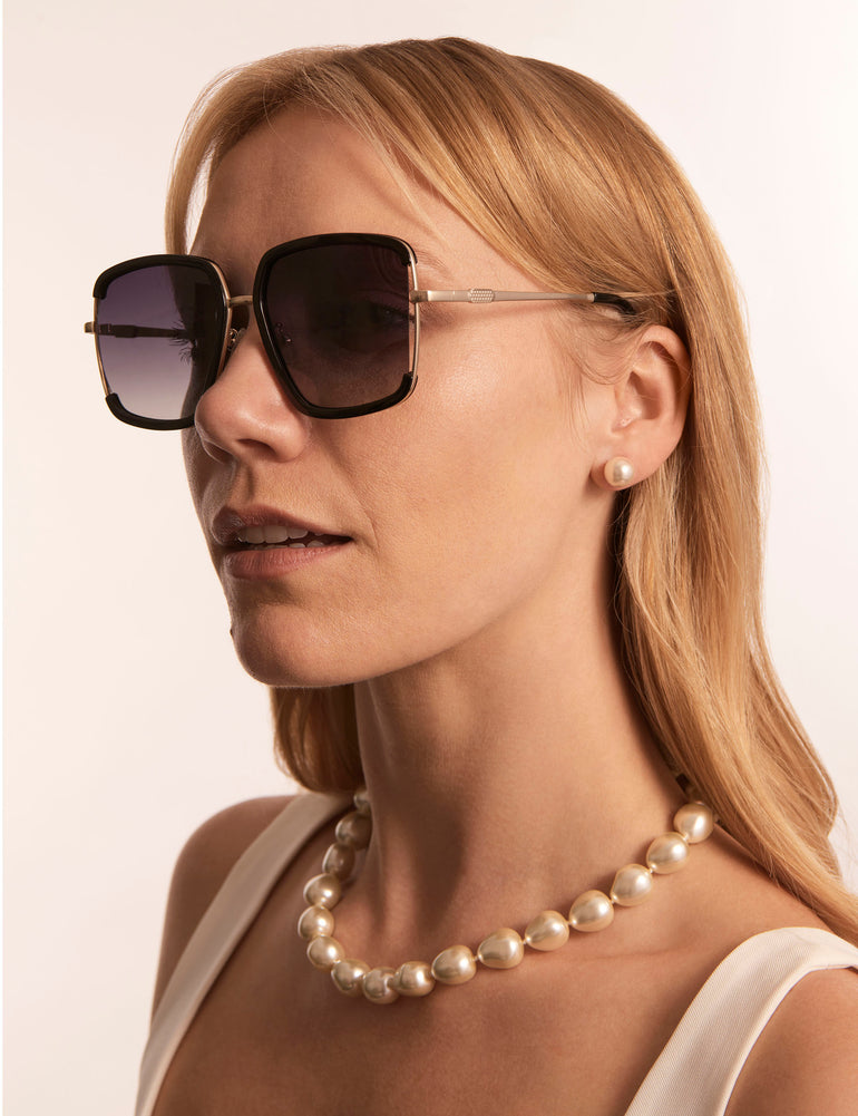 Make a chic statement with the stunning Yamba Sunglasses. These eye-catching sunnies are a flattering choice for almost any face shape, featuring a stylish square frame in glossy black, with sleek matte gold-coloured temples and black tips. With polarised lenses to help reduce glare and eyestrain, they’re perfect for everyday wear.