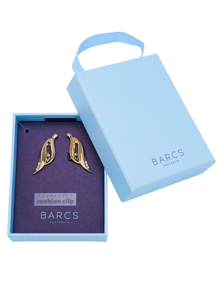 The Barcs Australia Zephyr Clip Earrings are a stunning addition to any outfit, and sure to be a favourite in your collection. These elegant clip earrings feature sleek curves in brilliant gold-coloured plating, with fine stone detailing for a beautiful touch of sparkle. Presented in a beautiful gift box, these earrings are a gorgeous choice to complete all your favourite looks. To complete your look, pair them with the Zephyr Brooch, available separately.