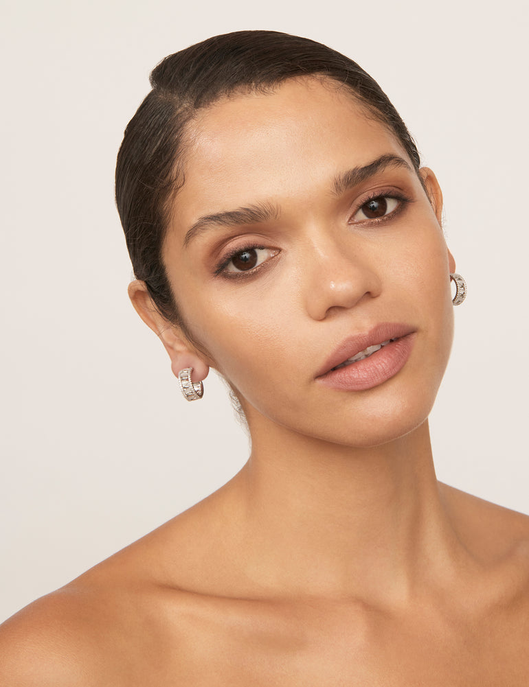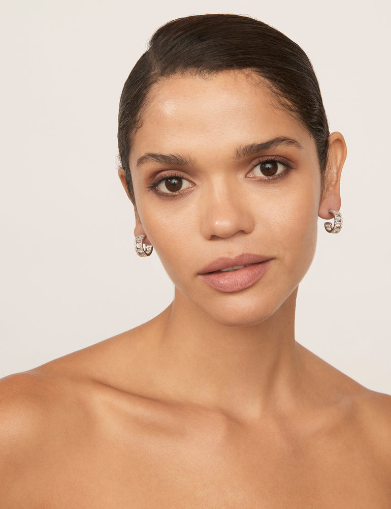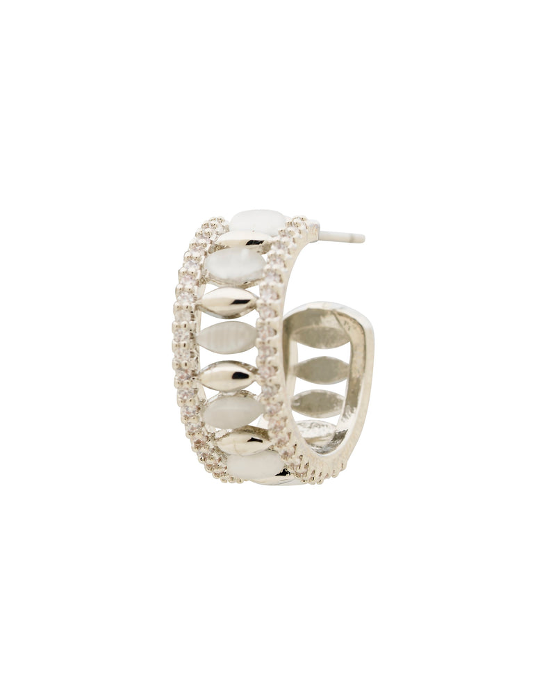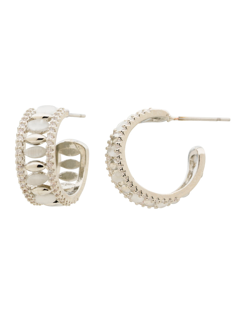 Choose classic style with a sleek modern twist with the Pebble Cateye Hoop Earrings. These petite hoops feature gleaming silver-coloured plating, glossy white cateye stone accents, and fine stone trim detailing for a subtle hint of sparkle.