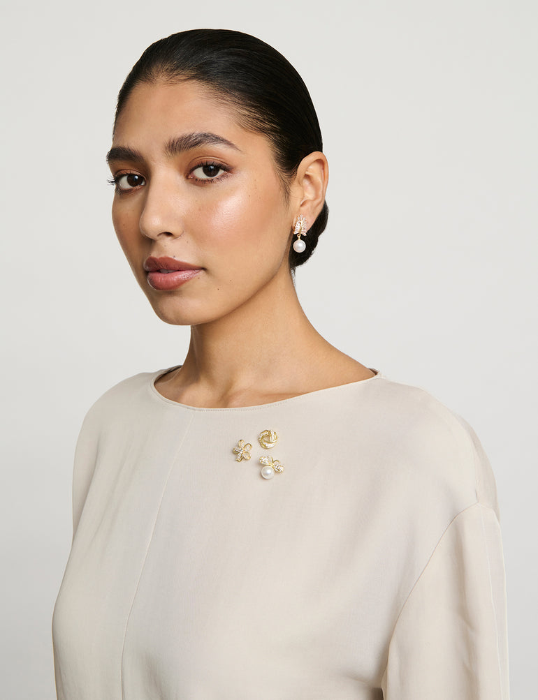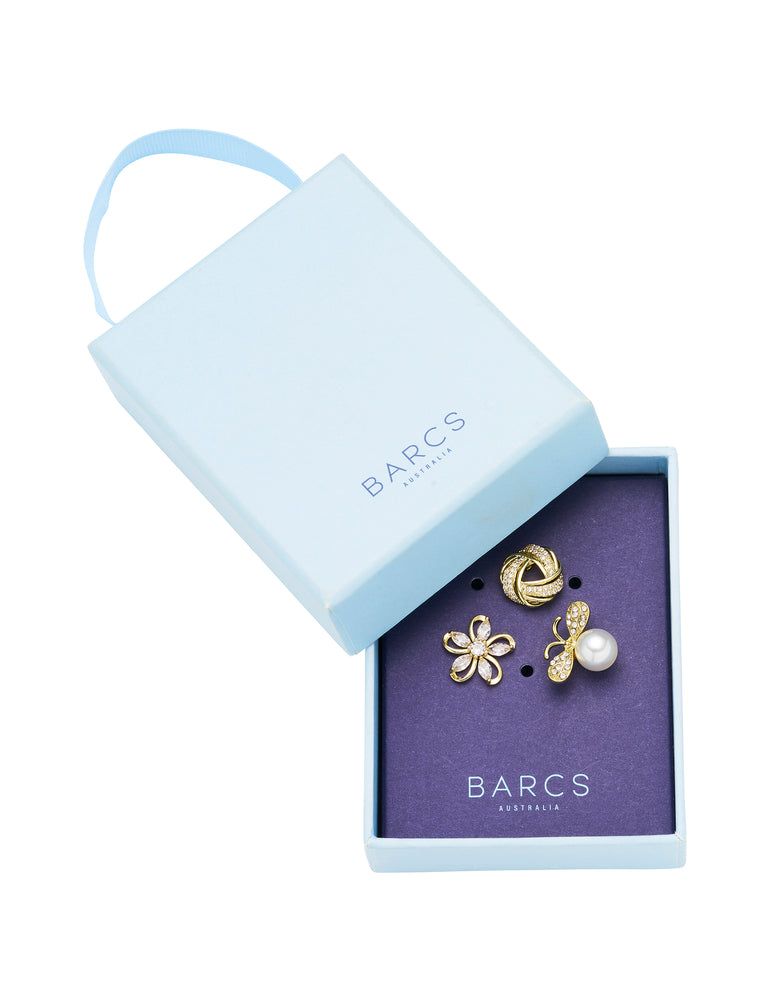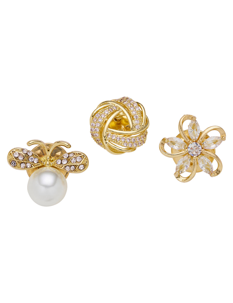 A trio of mini pin brooches in an elegant gift box from Barcs Australia. The set includes a knot design accented with crystals, a petite flower encrusted with crystals, and stylized bee featuring a large pearl and gold wings adorned with crystal. Pin them onto a lapel as a group or wear each pin alone.