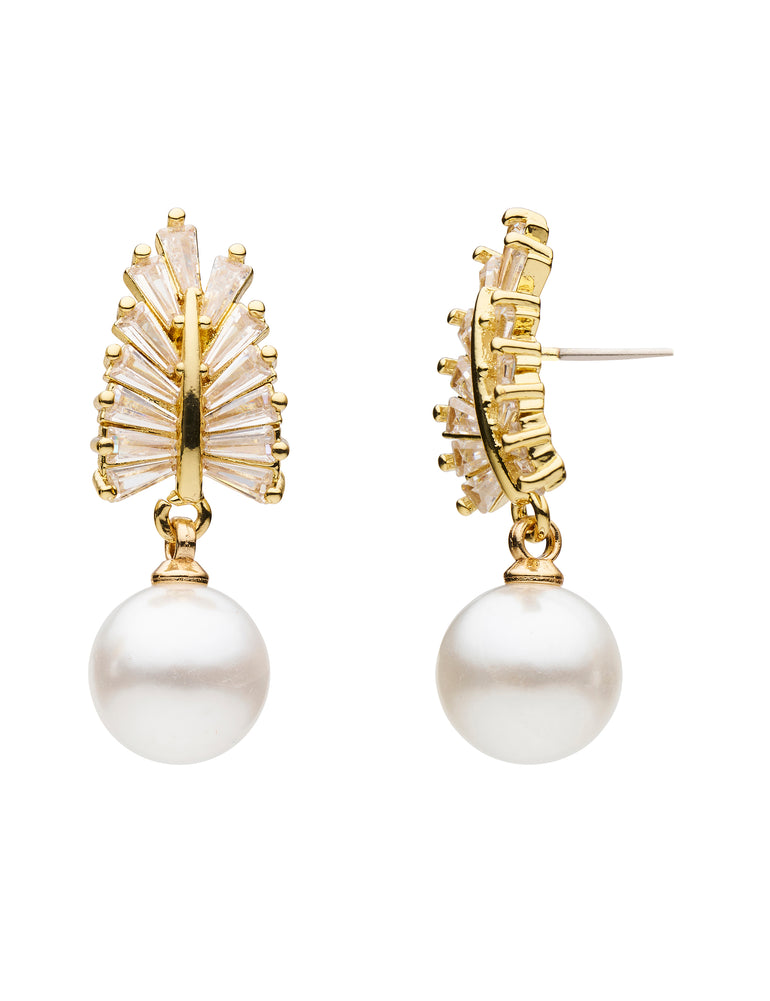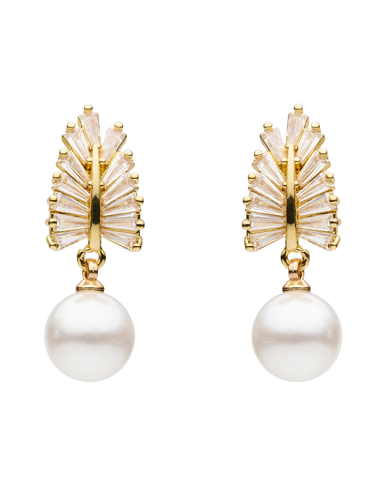 An exquisite combination of crystal stones set in a fan design with a beautiful round pearl drop. Perfectly formed for elegance and comfort the light reflective stones paired with a classic pearl allow these earrings to compliment any occasional wardrobe.