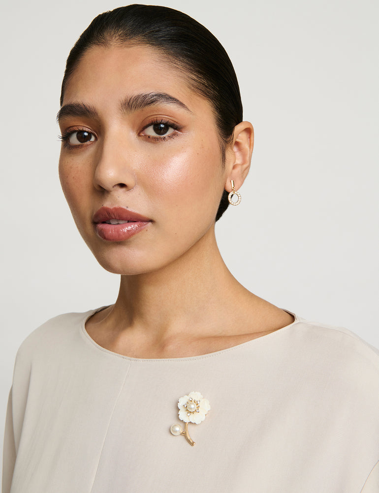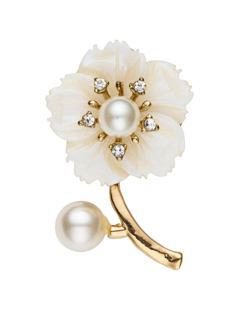 A sweet flower brooch featuring petals crafted from a pearlescent shell, a large round centre pearl surrounded by small sparkling crystals, and a curved gold stem, which holds a smaller pearl beneath the flower. A beautiful accessory for formal occasions or to elevate a sophisticated outfit.