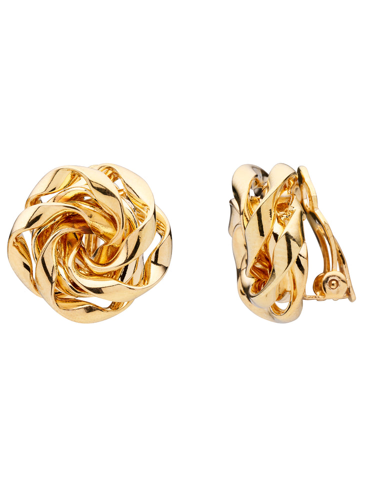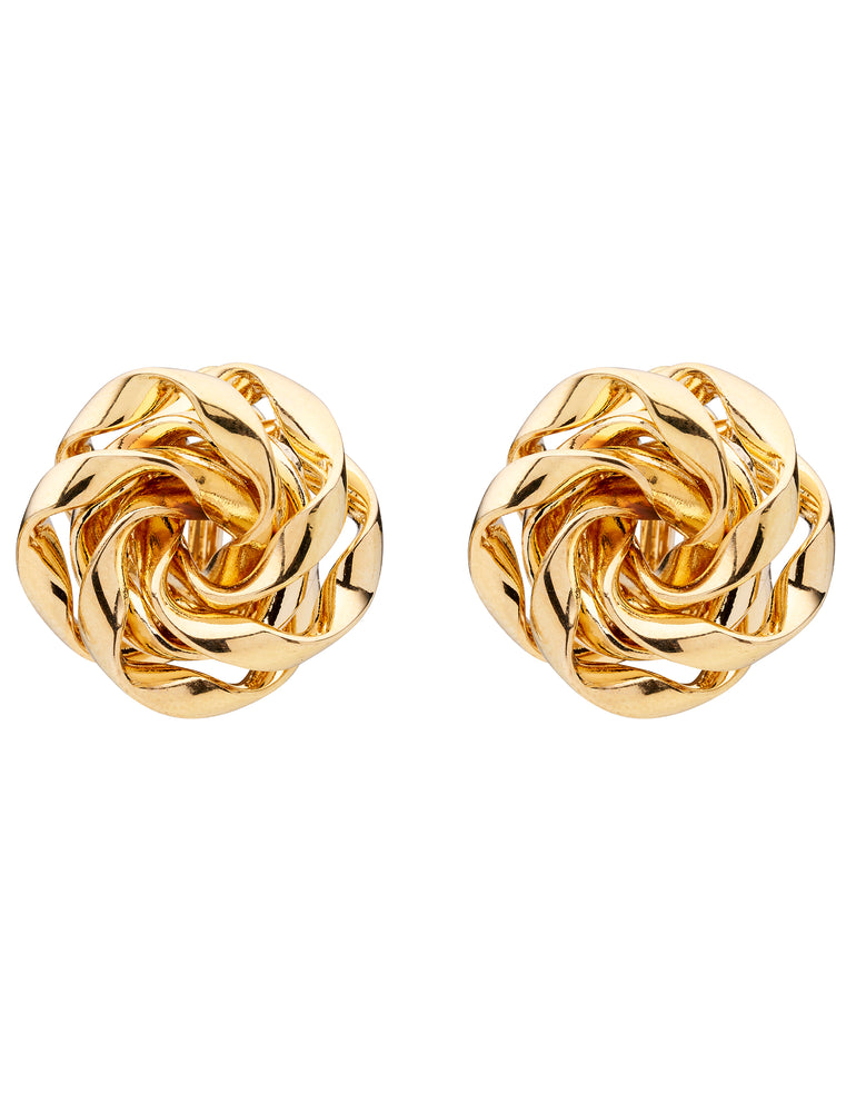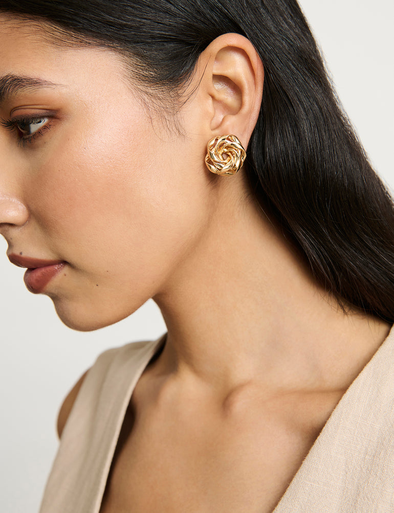 A bold yet classic pierced stud earring featuring a twisted design, resembling a rose made from shiny, interwoven metal strands. The polished surface gives them a high-gloss, reflective finish, enhancing their luxurious and timeless appearance.