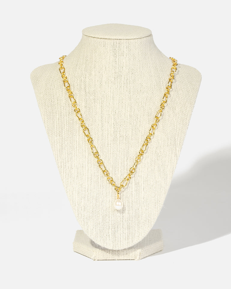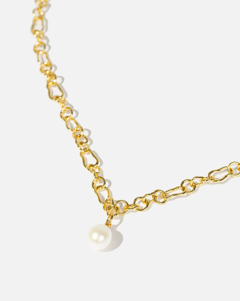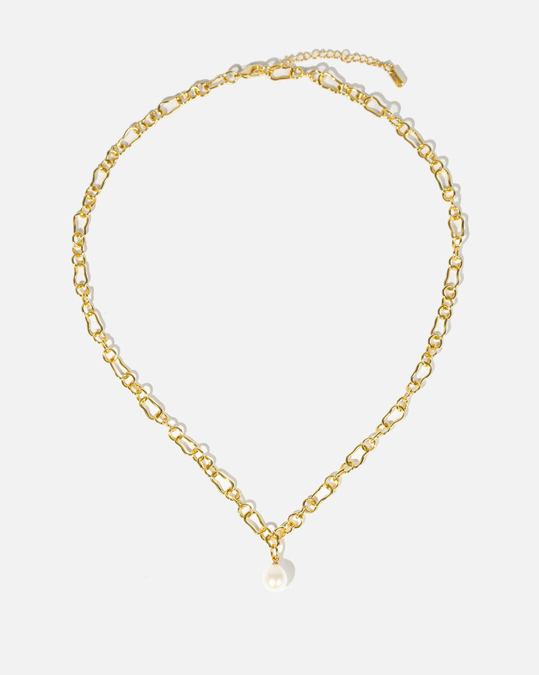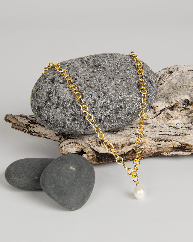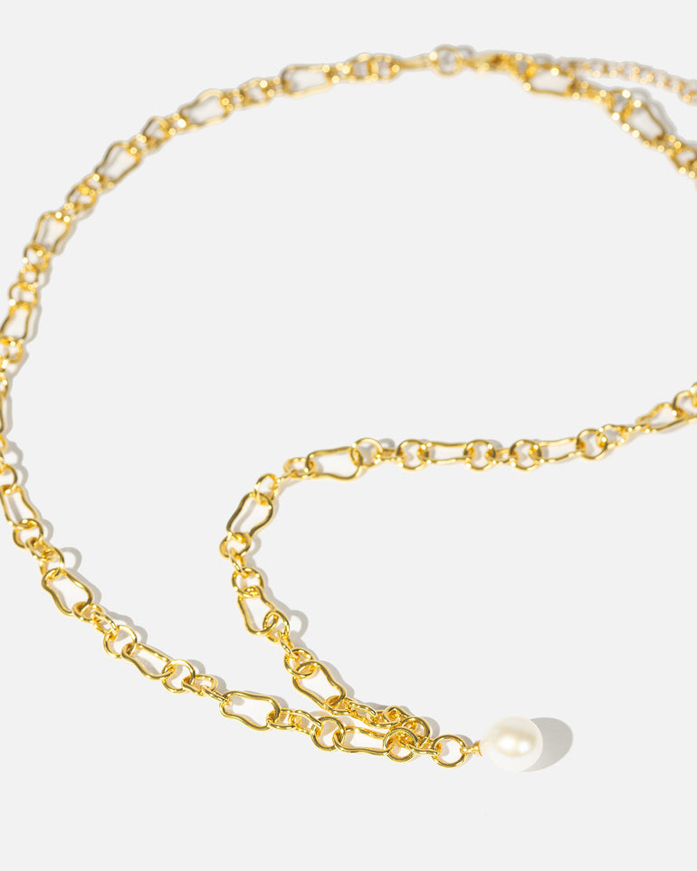 The Coastal Freshwater Pearl Chain Link Necklace is a twist on the classic pearl necklace. Featuring a luxruious freshwater tear-drop pearl with a unique organic link, motifs representing the meandering coastline. Made with a brass base and finished with opulent 18-carat gold plating.