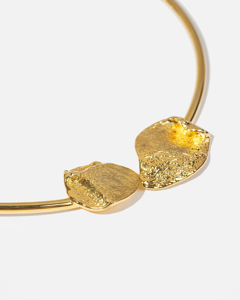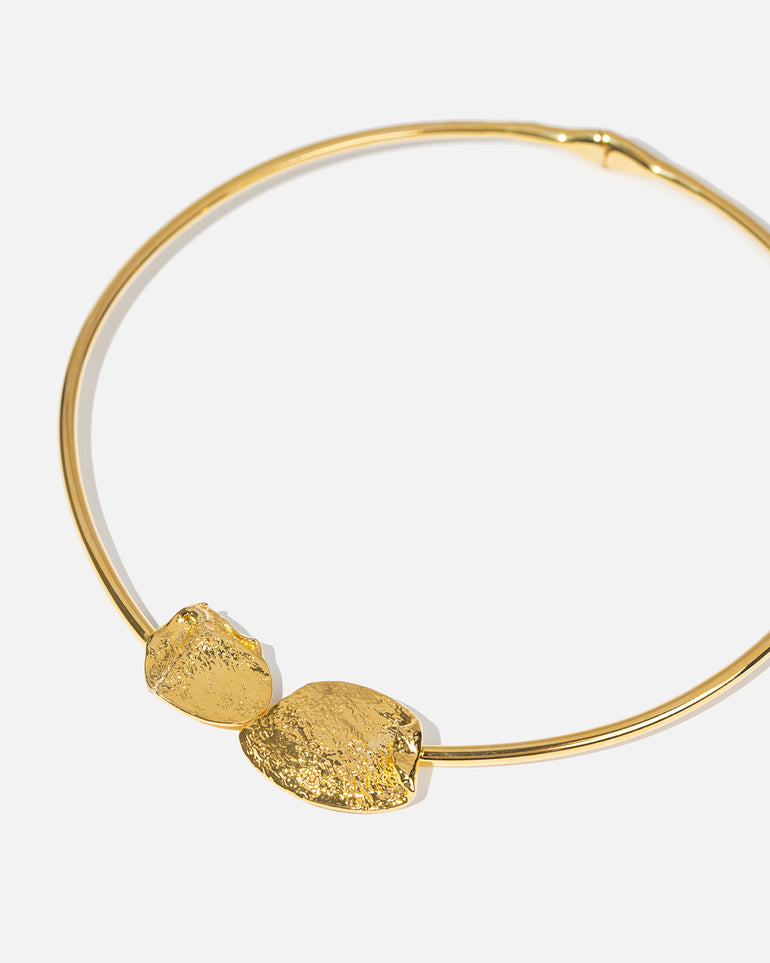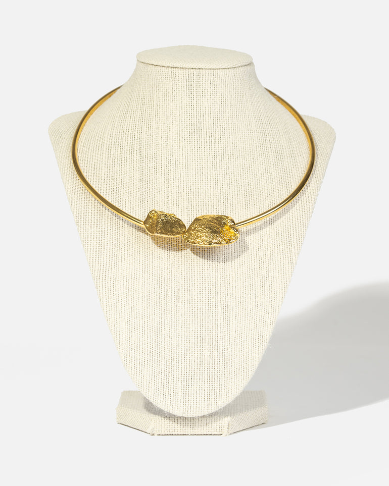 Make a statement with the Dollar Gum Collar Necklace. Featuring two textured leaves which mould to the body, and an easy to wear hinge mechanism. This is a real conversation starter as it pays a subtle homage to Australiana flora. Beautifully crafted using a brass base and plated in a rich 18-carat gold finish.