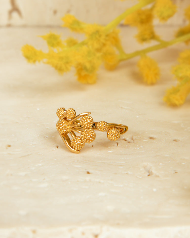 The Wattle Wrap Ring features a small cluster of wattle buds that wrap around the finger, creating a unique open ring design. Beautifully crafted using a brass base and plated in a rich, unique 22-carat gold, echoing the blooms of the wattle flower.