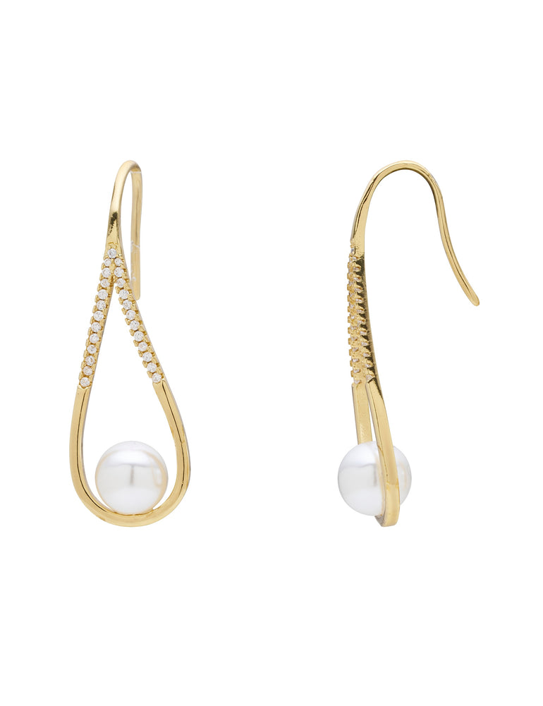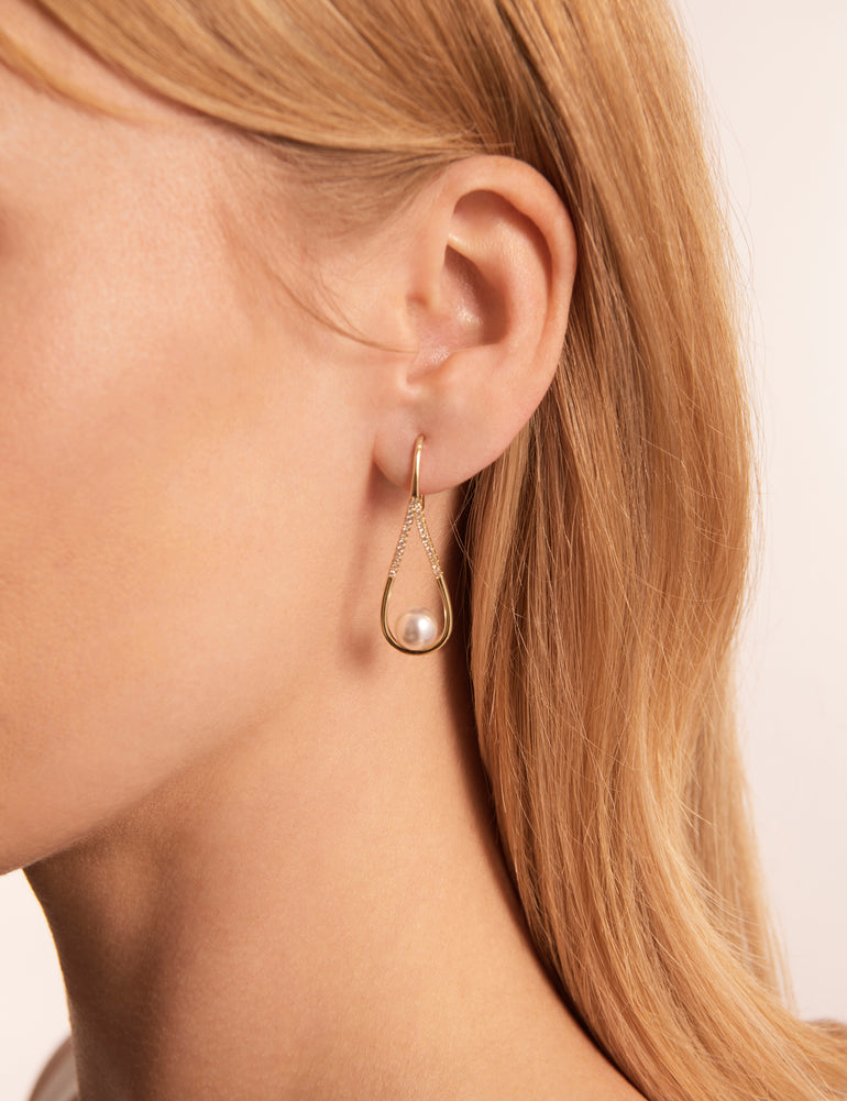 Choose an elegant finish for day or evening outfits with the Pearl Balance Hook Earrings from Barcs Australia. These stunning earrings feature sleek teardrops in bright gold-coloured plating, with fine stone detailing for a subtle touch of sparkle, and glossy faux pearl accents.