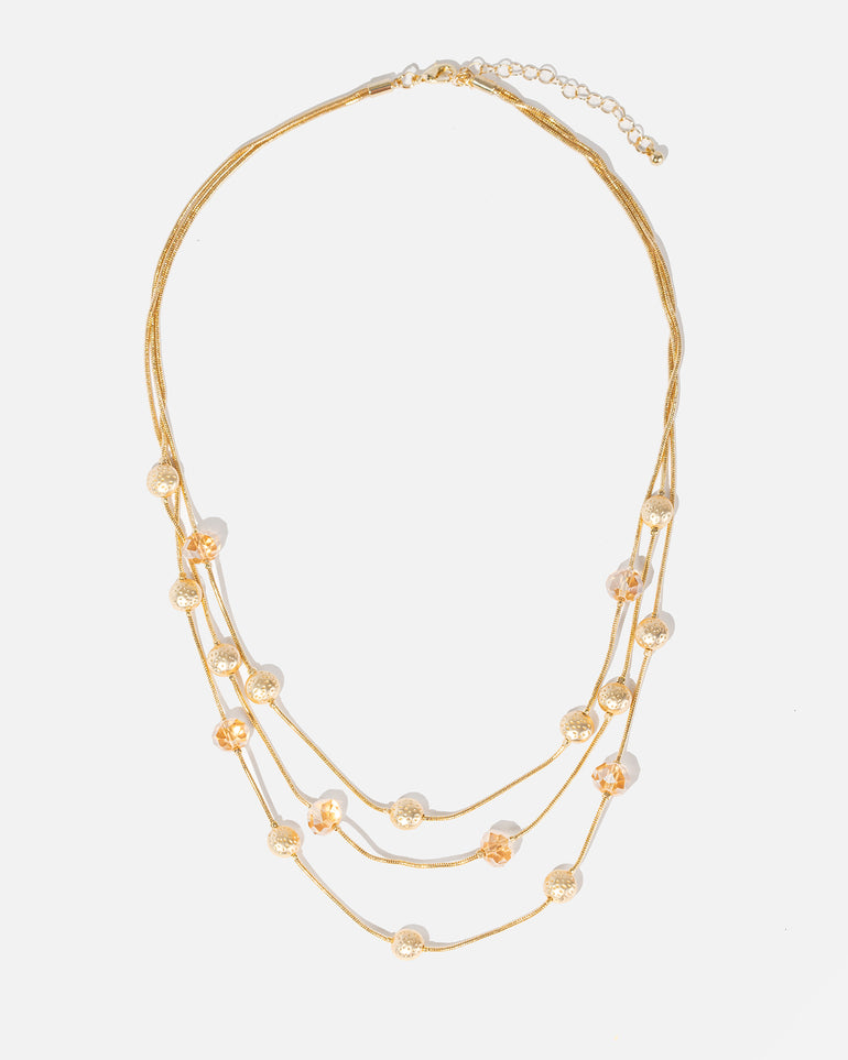 Dress up your look with the Crystal Bead Station Necklace. This eye-catching multi-strand necklace features layered chains with crystal stone and hammered bead details. Pair it with smart blouses for desk-to-dinner style, or with your favourite cocktail dresses or evening looks.