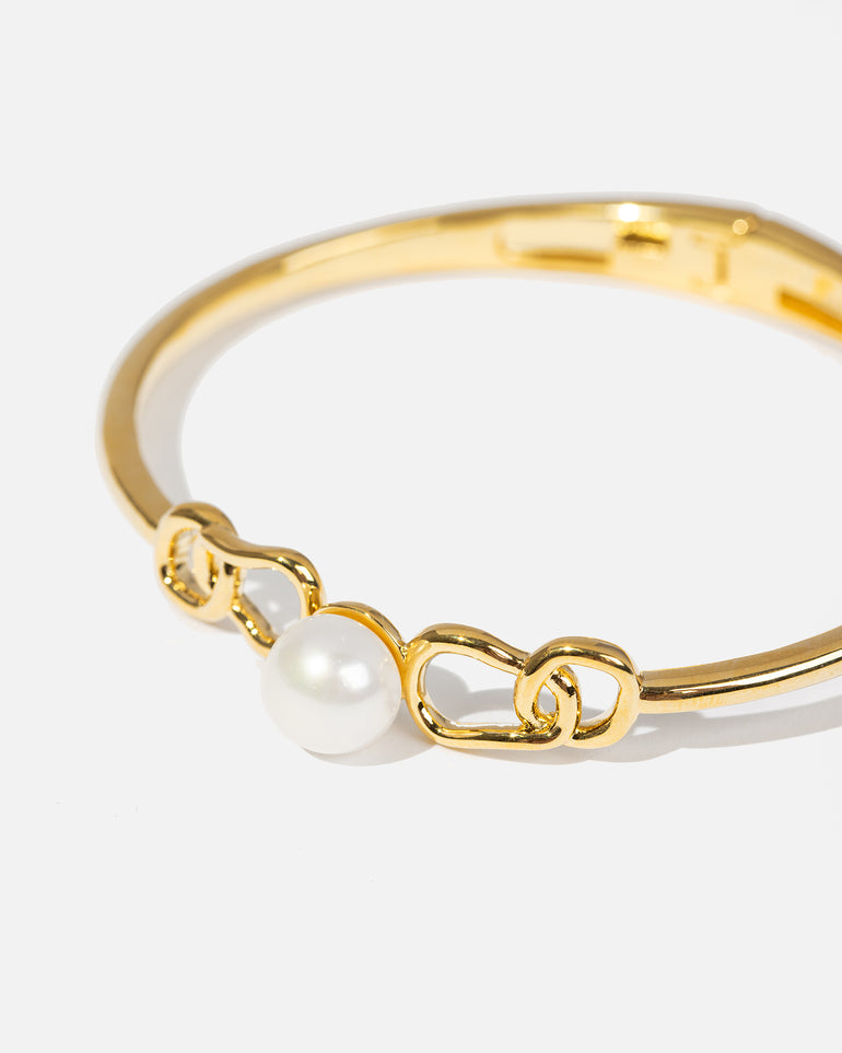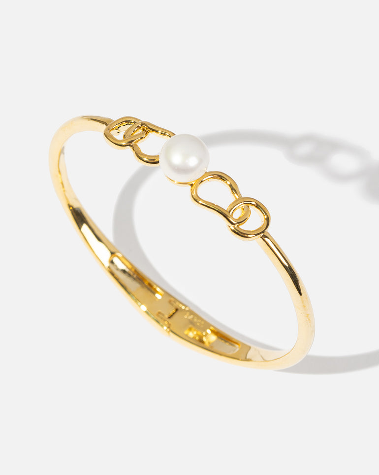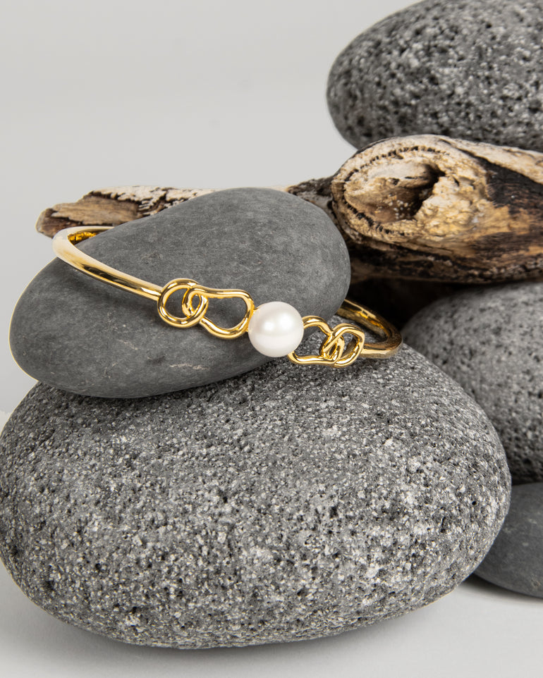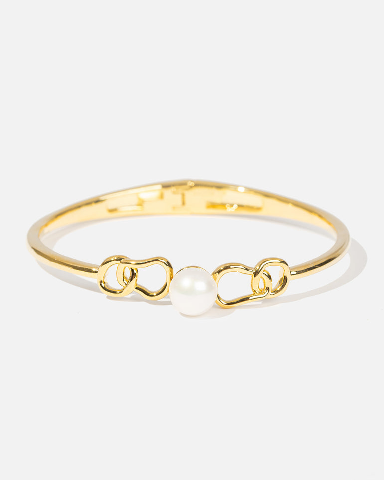 The Coastal Freshwater Pearl Bangle is a twist on the classic pearl bracelet. Featuring a freshwater button pearl encapsulated by a unique, intertwined link. Made with a brass base and finished with opulent 18-carat gold plating.