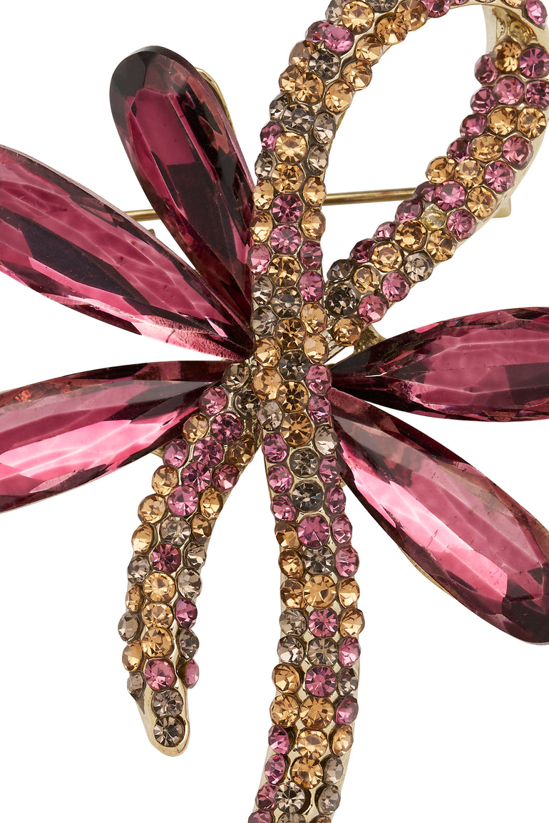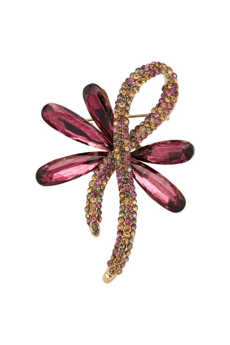 A sweet decorative brooch featuring elongated marquise cut stones radiating like flower petals or loops of a bow. Intertwined with the petals is a ribbon, encrusted with small crystals, adding shimmer and texture. Suitable for accessorising coats, dresses, or scarves for formal events or special occasions.