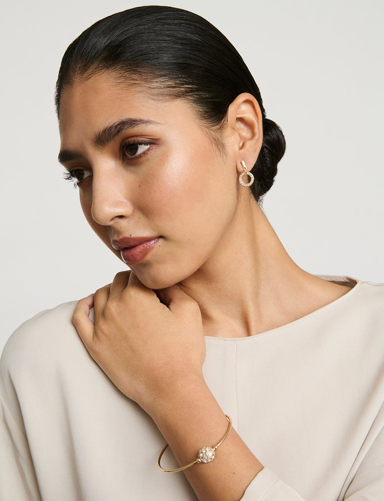 A delicate and simple circular band bangle in a polished metal finish with a reflective crystal pave set ball feature. Wear along or as part of a wristwear stack, it is the perfect finishing touch.