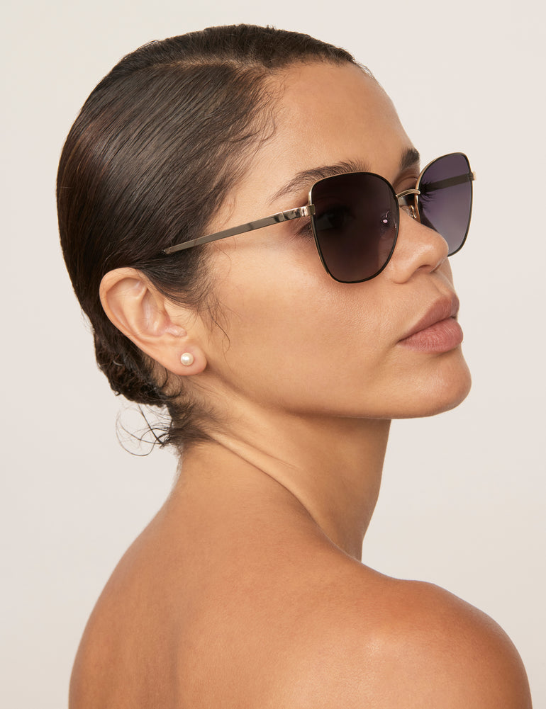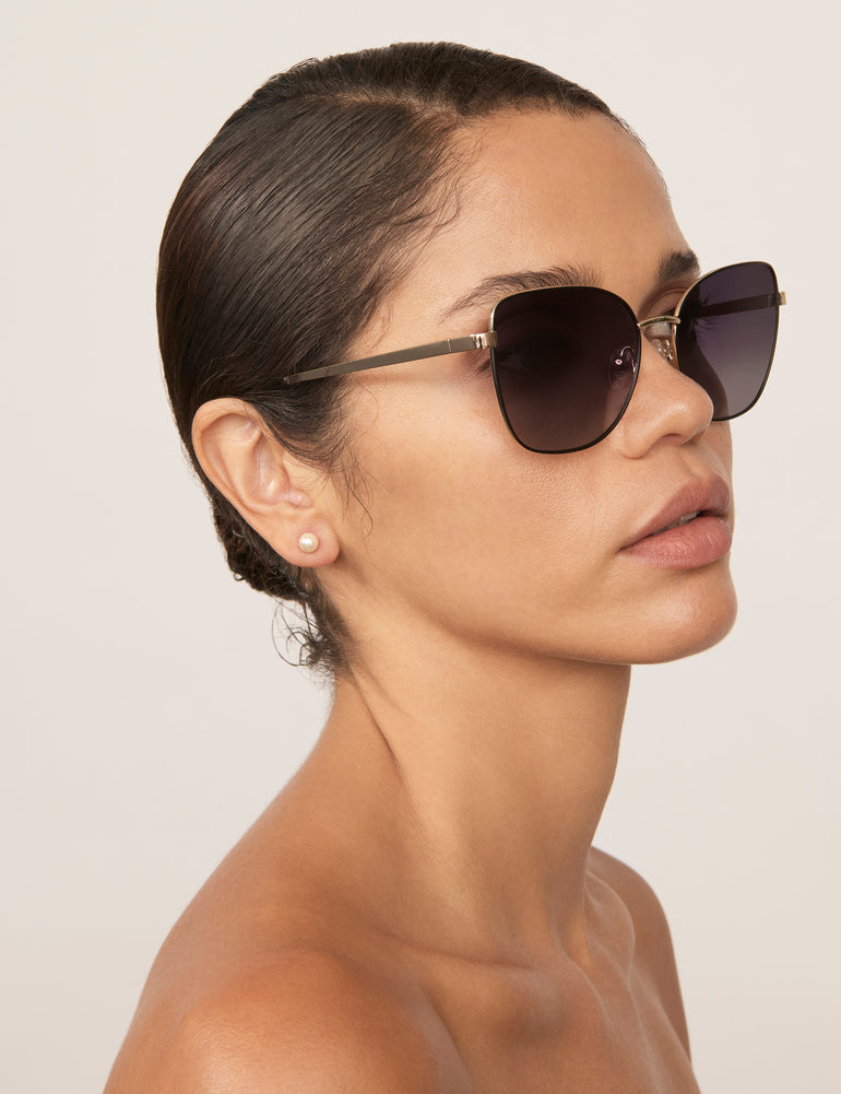 The elegant Manly Sunglasses from Barcs Australia are a beautiful choice to flatter most face shapes. These striking, handcrafted square cat eye frames feature metal frames with polished gold-coloured plating with black rims and tips, and polarised blue smoke lenses to reduce glare and protect against UV, perfect for pairing with your summer style or dressing up stylish winter-wear.