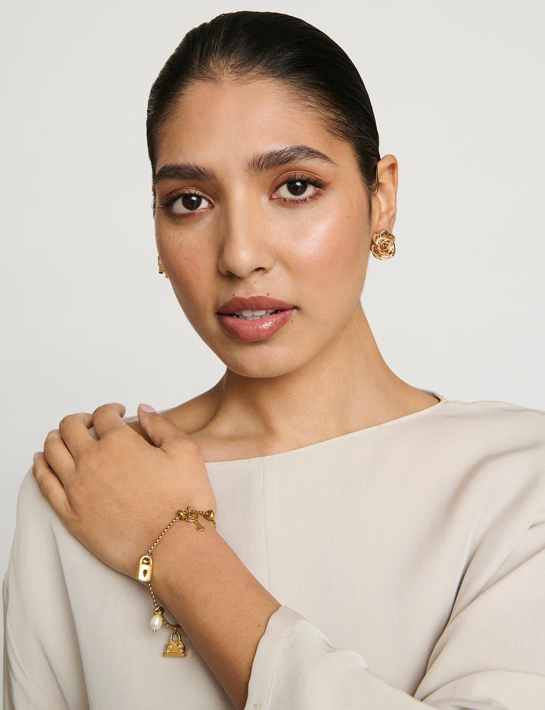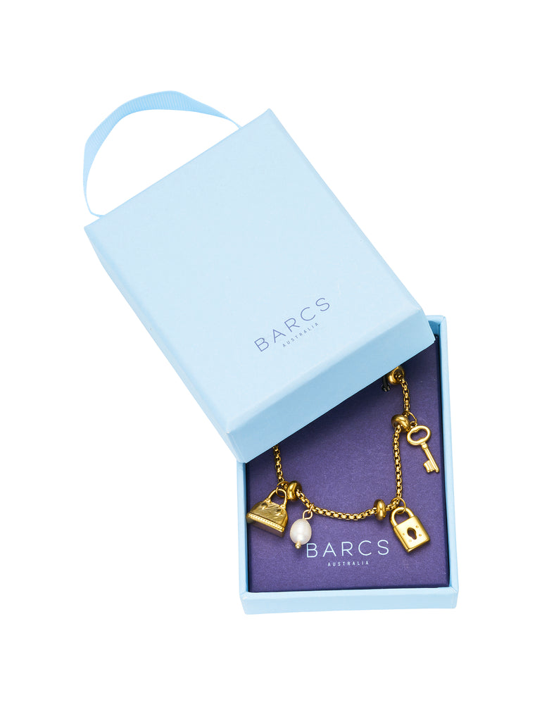 A whimsical charm bracelet by Barcs Australia presented in an elegant gift box. The charms feature a hangbag, padlock, key, and freshwater pearl. These stylish charms give the bracelet a playful yet sophisticated look, making it suitable as a thoughtful gift or a fashionable personal accessory.