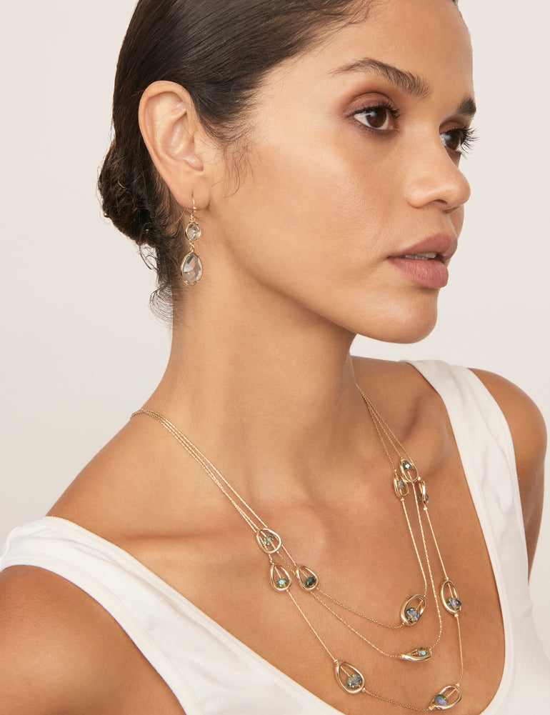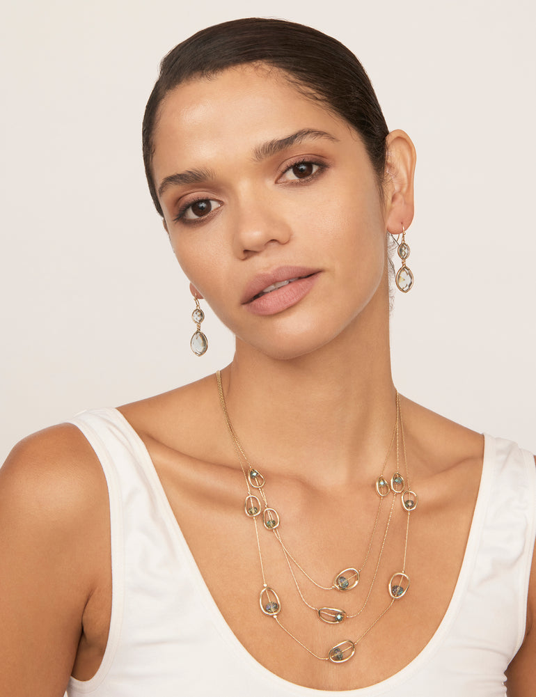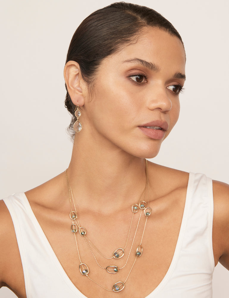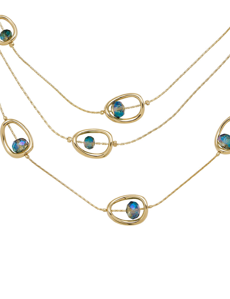 Add gorgeous sparkle and shine to your favourite looks with the beautiful Ellipse Station Necklace from Barcs Australia. This stunning multi-strand necklace features fine gold-coloured chains with gold-coloured rings and faceted accents in sparkling pale blue, perfect for bringing a touch of contemporary style to any outfit.