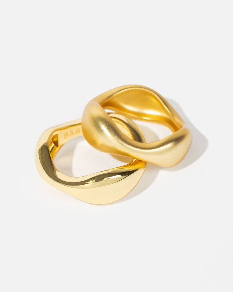 The Coastal Ring Set features two organically shaped rings that stack seamlessly together. One high polish, and one satin brushed, they can be worn together or one at a time. Made with a brass base and finished with opulent 18-carat gold plating.