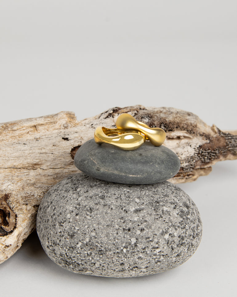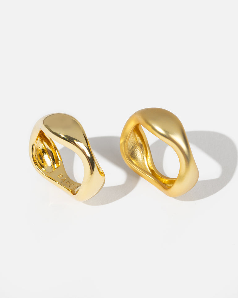The Coastal Ring Set features two organically shaped rings that stack seamlessly together. One high polish, and one satin brushed, they can be worn together or one at a time. Made with a brass base and finished with opulent 18-carat gold plating.