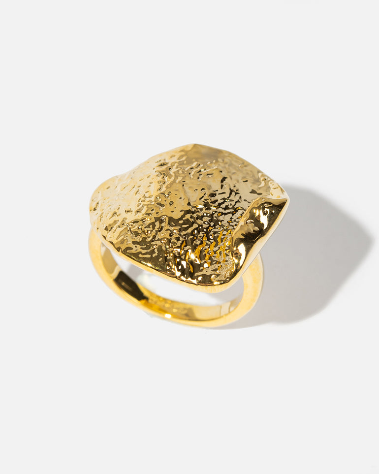 A subtle nod to Australian flora, the Dollar Gum Ring features a single textured dollar gum leaf. Beautifully crafted using a brass base and plated in a rich 18-carat gold finish.
