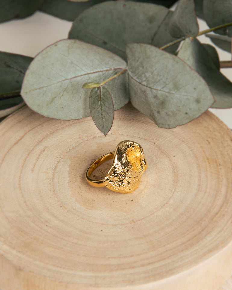 A subtle nod to Australian flora, the Dollar Gum Ring features a single textured dollar gum leaf. Beautifully crafted using a brass base and plated in a rich 18-carat gold finish.