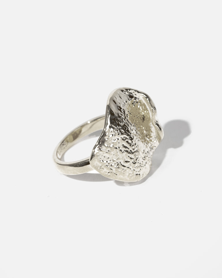 A subtle nod to Australian flora, the Dollar Gum Ring features a single textured dollar gum leaf. Beautifully crafted using a brass base and plated in an opulent, unique rhodium finish.