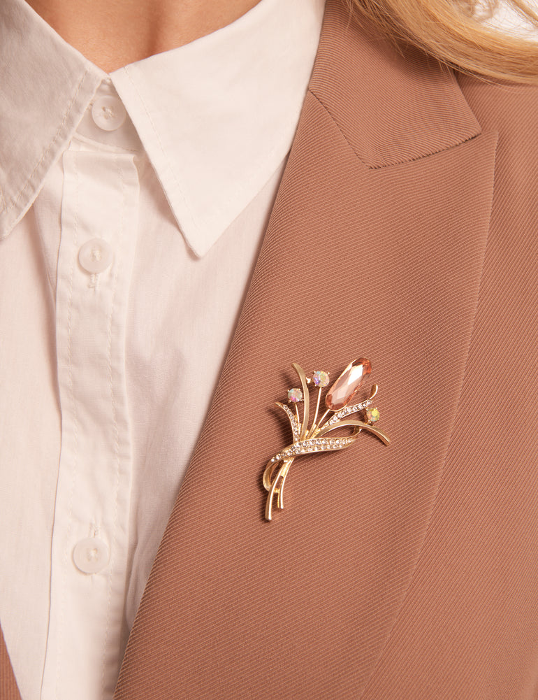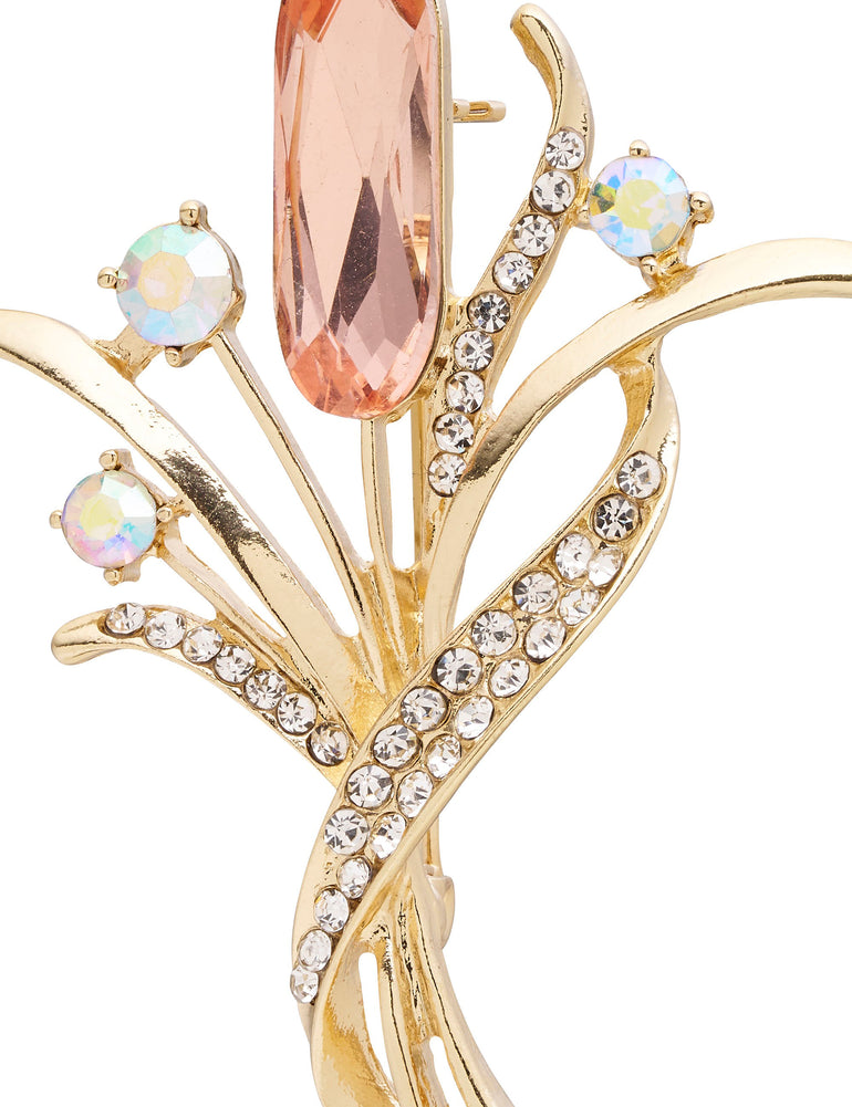 The stunning Reed Bouquet Brooch is sure to bring a beautiful finish to your favourite looks. With bright gold-coloured plating, gorgeous sparkling accents, and a faceted feature stone in a chic apricot tone, this eye-catching brooch is perfect for elevating your everyday looks or adding a touch of elegant sparkle to formal outfits.
