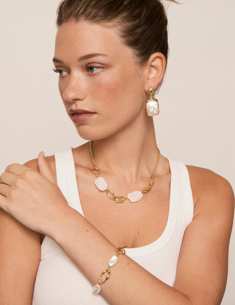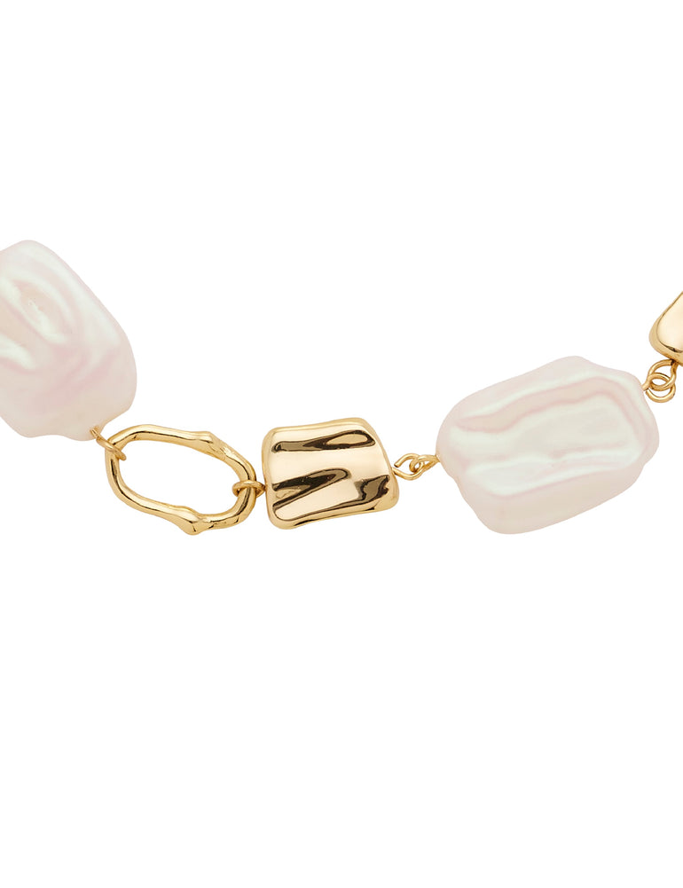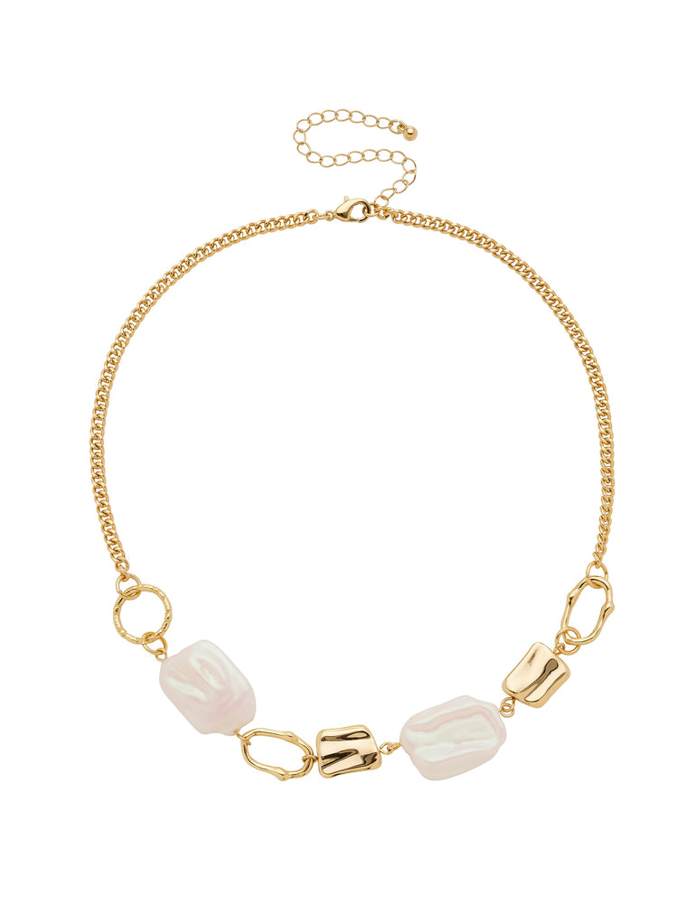 The stunning Statement Pearl Necklace is a perfect piece to pair with chic blouses and dresses, or to dress up casual tees and sundresses. This gorgeous necklace features brilliant gold-coloured links with a beaten finish and glossy faux pearl accents.