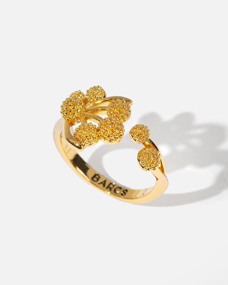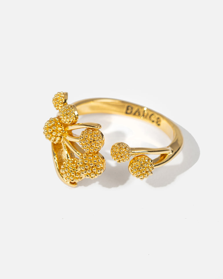 The Wattle Wrap Ring features a small cluster of wattle buds that wrap around the finger, creating a unique open ring design. Beautifully crafted using a brass base and plated in a rich, unique 22-carat gold, echoing the blooms of the wattle flower.